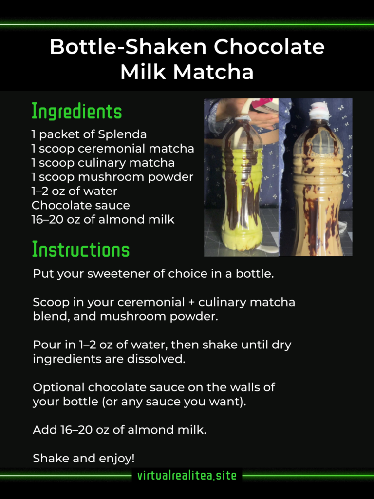 All you need is a bottle, your favorite powders, milk, and a good shake. I usually use a mix of ceremonial and culinary matcha, add mushroom powder, a sweetener of choice, and shake everything with a little water. I love to add dark chocolate sauce along the inside of the bottle before pouring in the milk — those chocolate walls just make it better.
