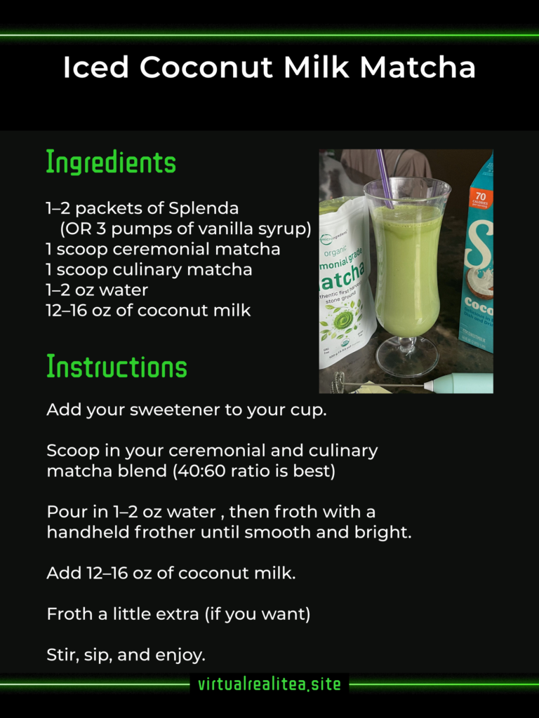This iced matcha latte is quick, simple, delicious, and surprisingly healthy. I love it! and honestly, it’s the best gaming fuel for Virtual RealiTea.